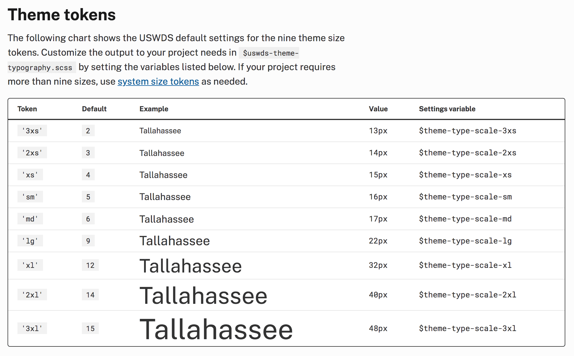 US Web Design System showing type size tokens