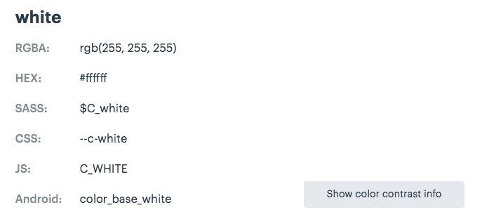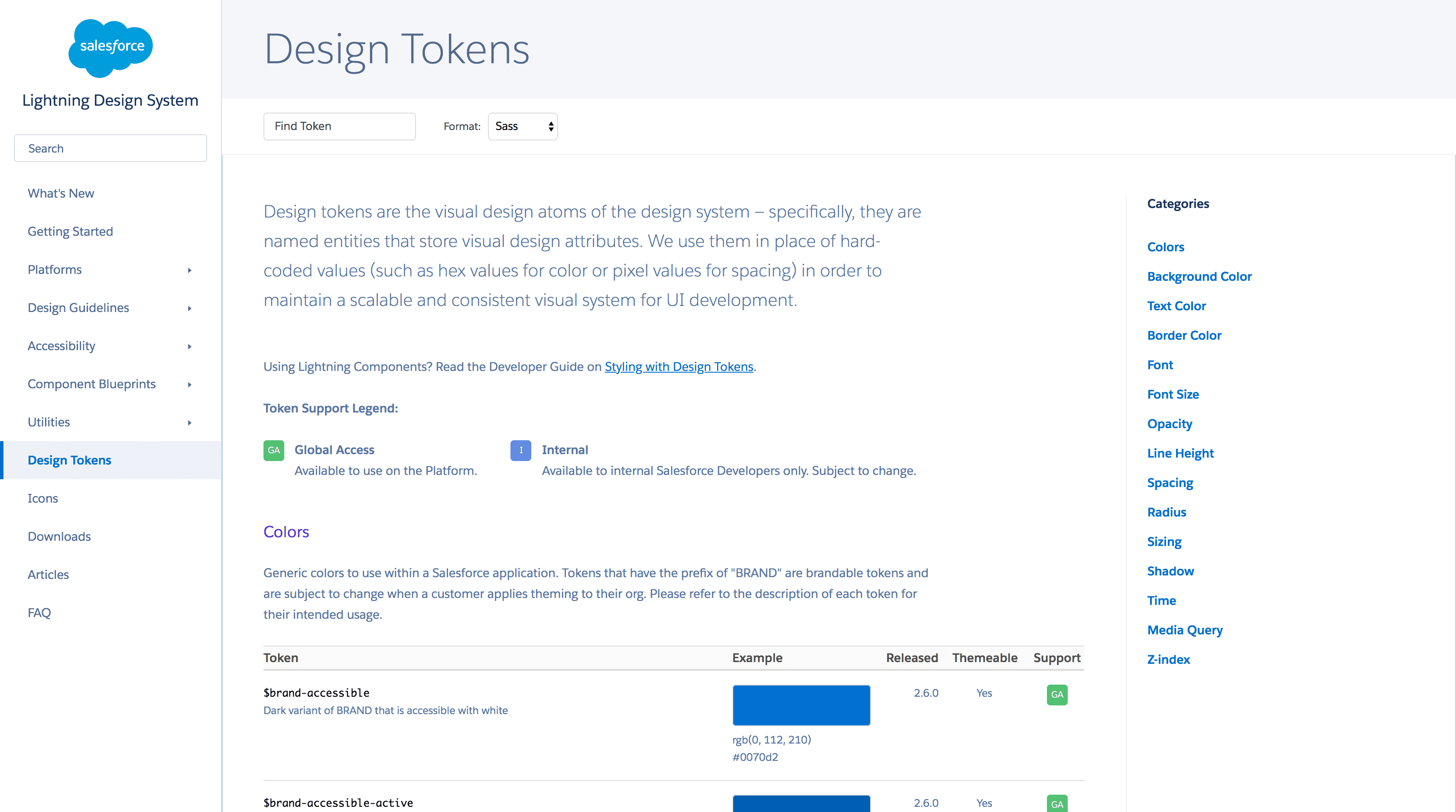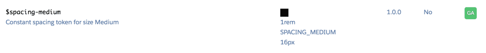 Some design tokens have extra attributes or metadata that is shown as well. Salesforce Lightning shows 3 extra attributes: what version it was released in, if it is themeable, and if it is for internal or external use.
