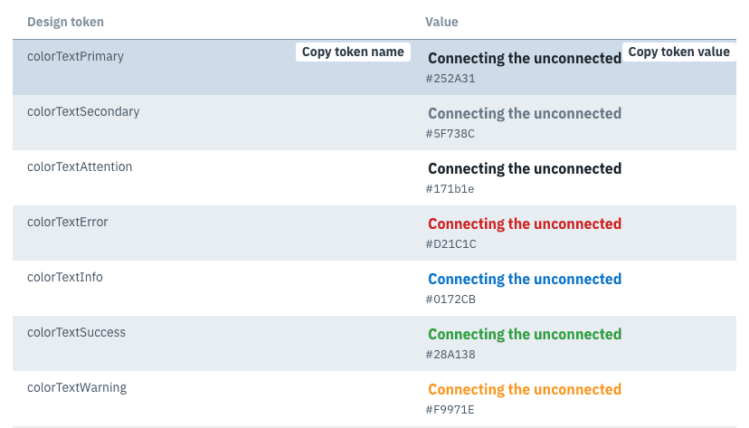 1. I am specifically not writing about naming conventions, how to organize and build design tokens, how to distribute or use them, or anything not related to documenting them. Stuart Robson has a great Github repo that has articles and talks and tools if you want to know more about design tokens in general: Awesome Design Tokens.