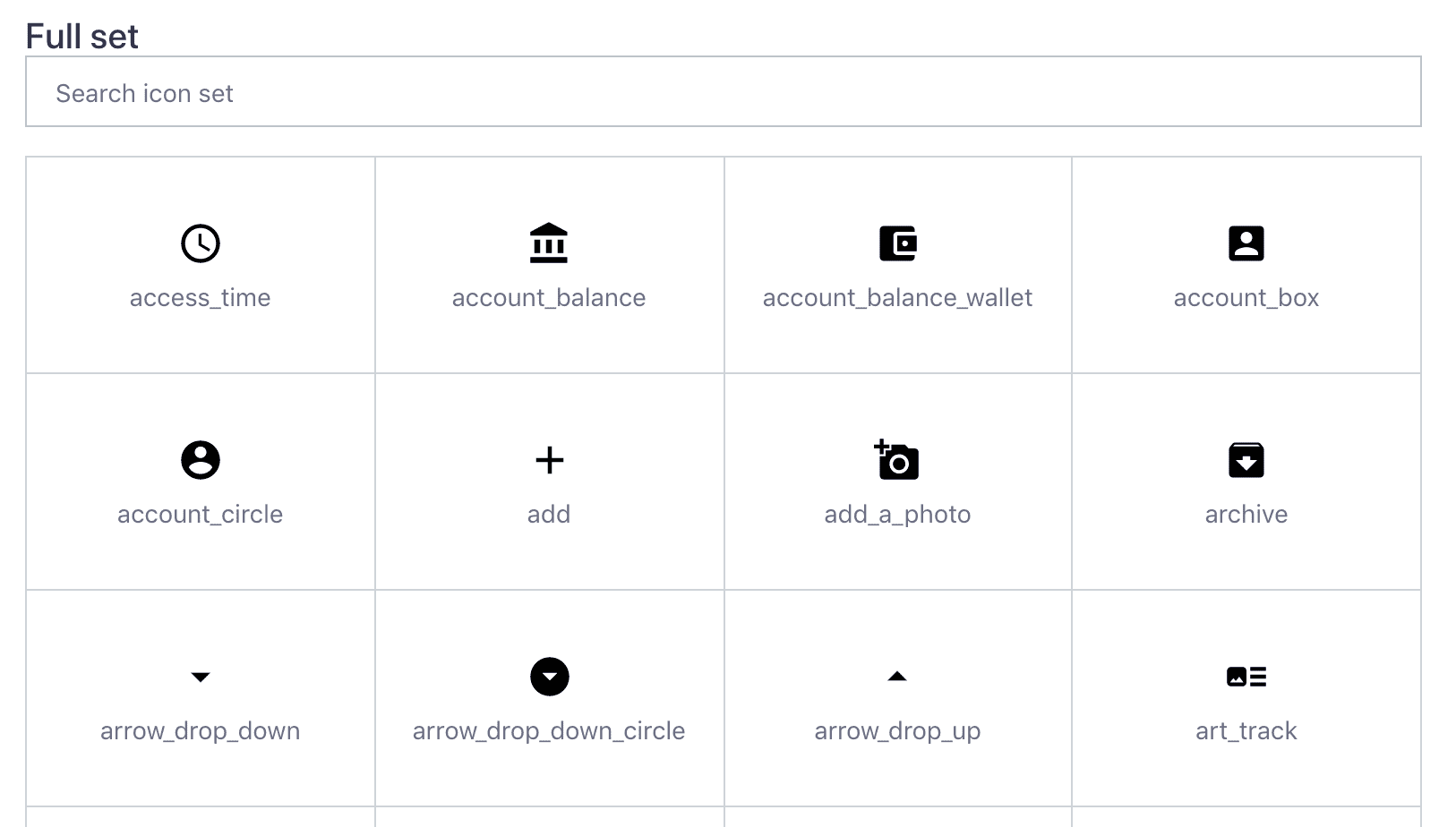 Most design systems show the actual icon itself, as well as the name or string to reference it.If you have a lot of icons, it might be a good idea to have them searchable. Grouping icons by use, for example action, status, or social, can be useful. Kalo design system has groups of icons and the ability to search all icons.