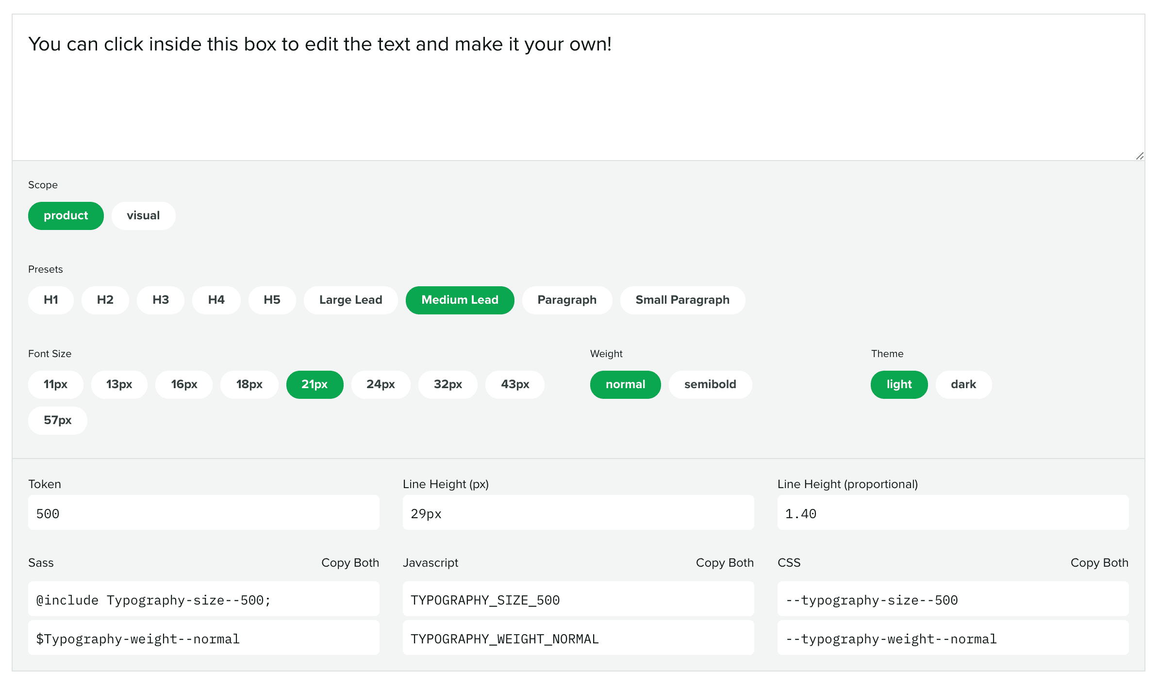 Typography is interesting in that there are ‘compound’ tokens as well; ones which group multiple lower-level tokens together. For example you might have a ‘heading1’ token that has font-size, color, line-height, and letter-spacing values. I won’t get too far into the different ways to do this, that deserves its own article. Sprout Social Seeds has a typography picker and an editable text area so you can customize the text: