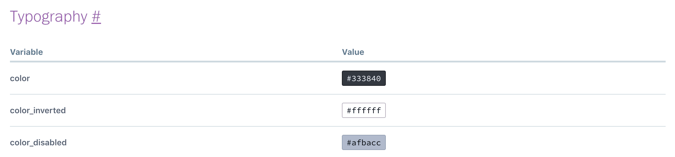 If you have design token pages that are really long, it can be a good idea to provide anchor links so your users can send or bookmark the exact location of the documentation. A lot of design systems do this, for example Mineral UI, Sprout Social Seeds, Thumbprint, and Udacity Veritas.