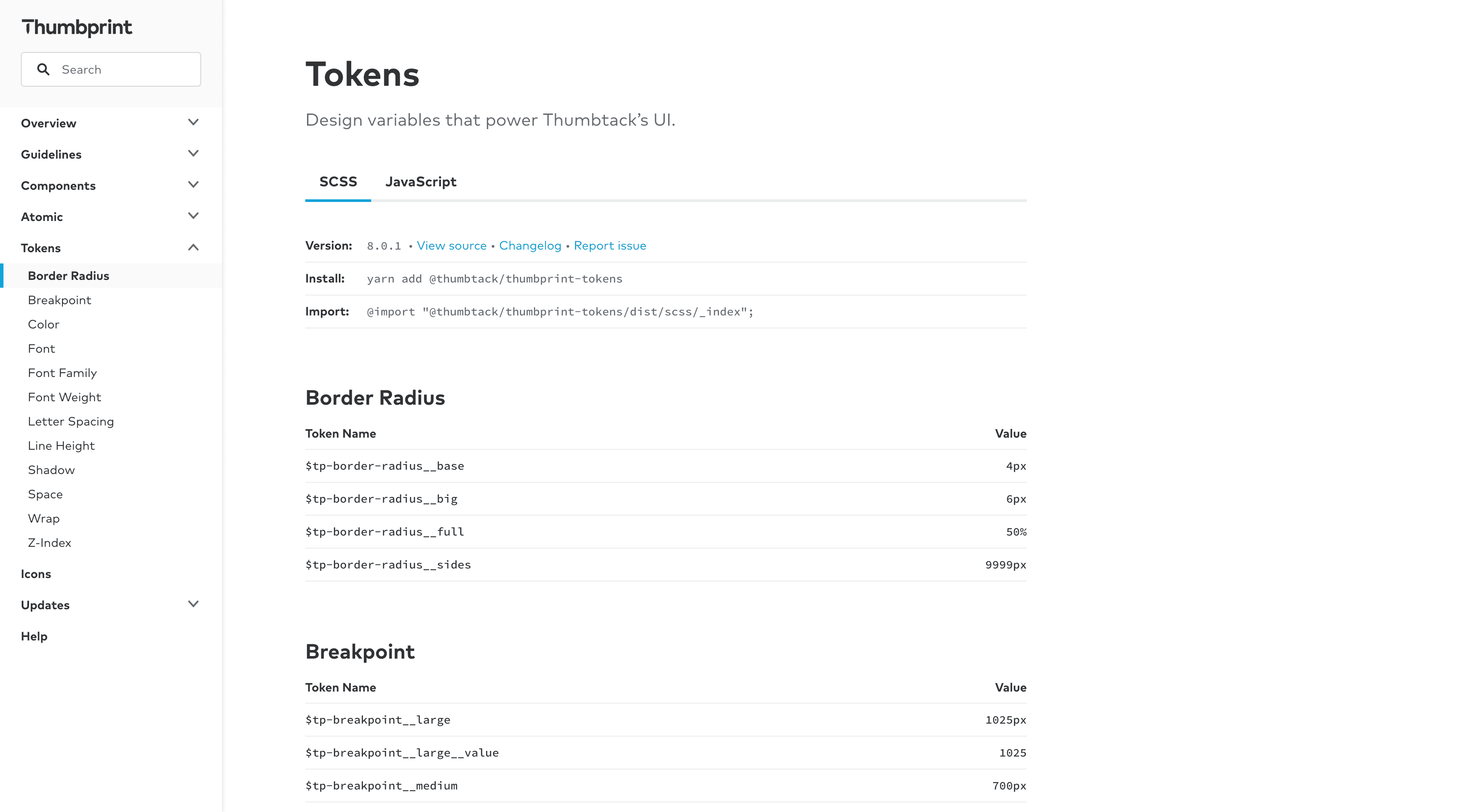 Thumbprint design token page showing platform dropdown