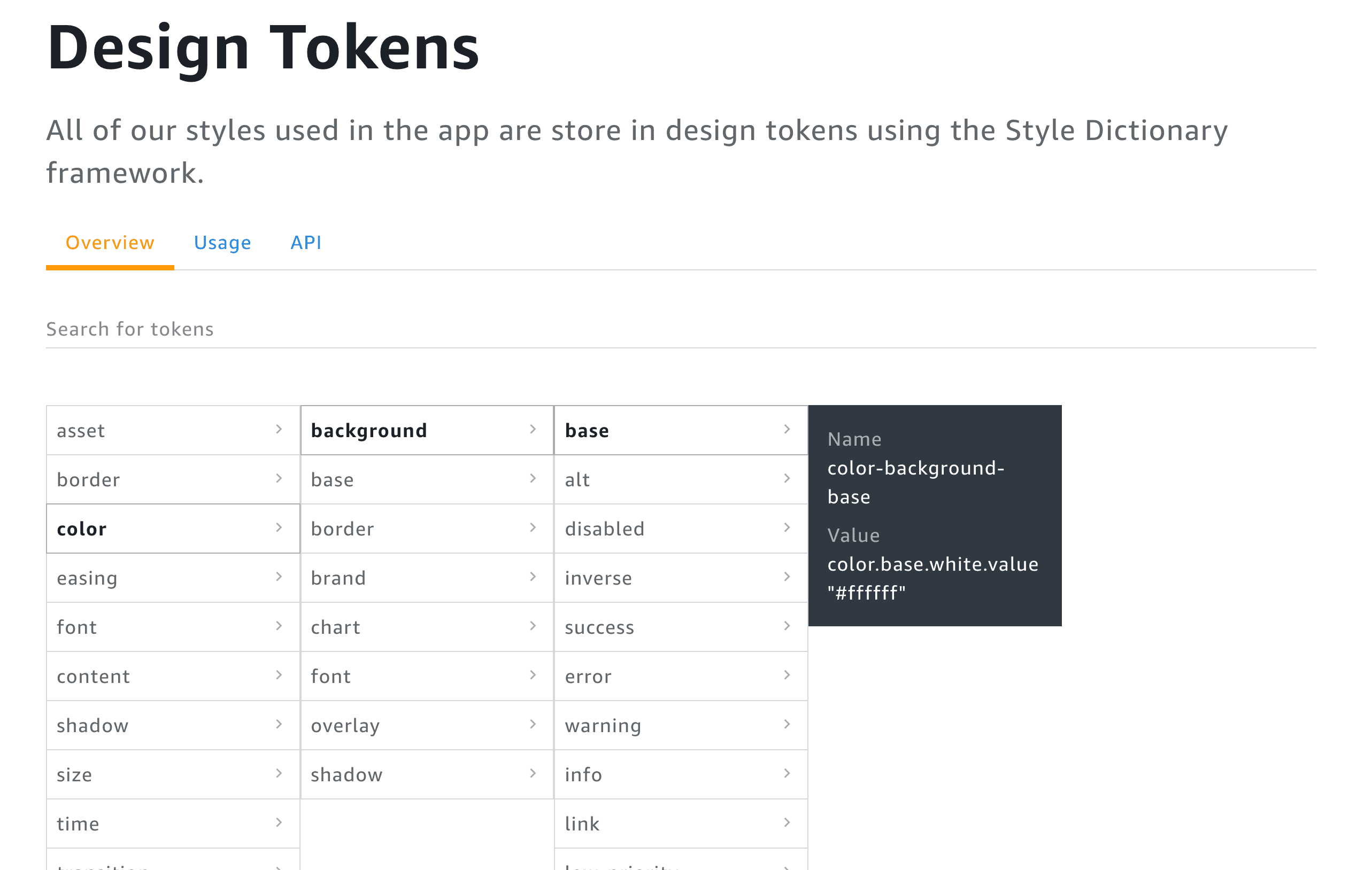 Infor Design System has a very detailed design tokens page that explains what design tokens are, how to install and use them, a list of all tokens, and dives deep on different levels of tokens and their naming convention.