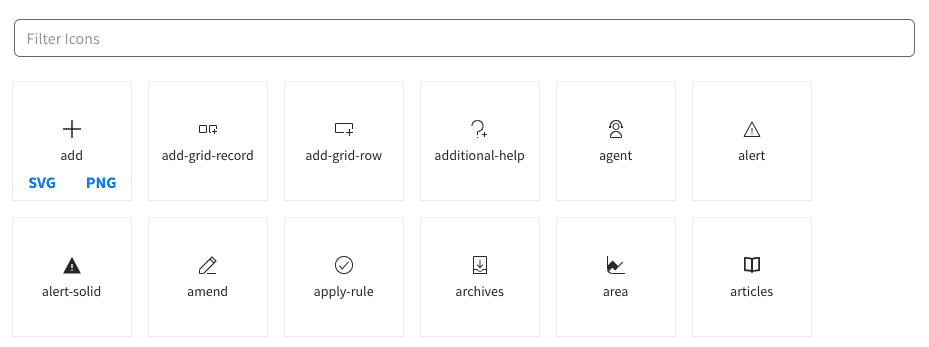Being able to copy or download a specific icon can be useful for people trying to add an icon to a mockup or wireframe. If you use an icon font you could allow the unicode character to be copied, or if you use SVG you could also copy the full SVG string into the user’s clipboard. The Infor design system provides buttons to download SVG and PNG versions of the icon when you hover over them. Shopify Polaris also lets you download the SVG of an icon.