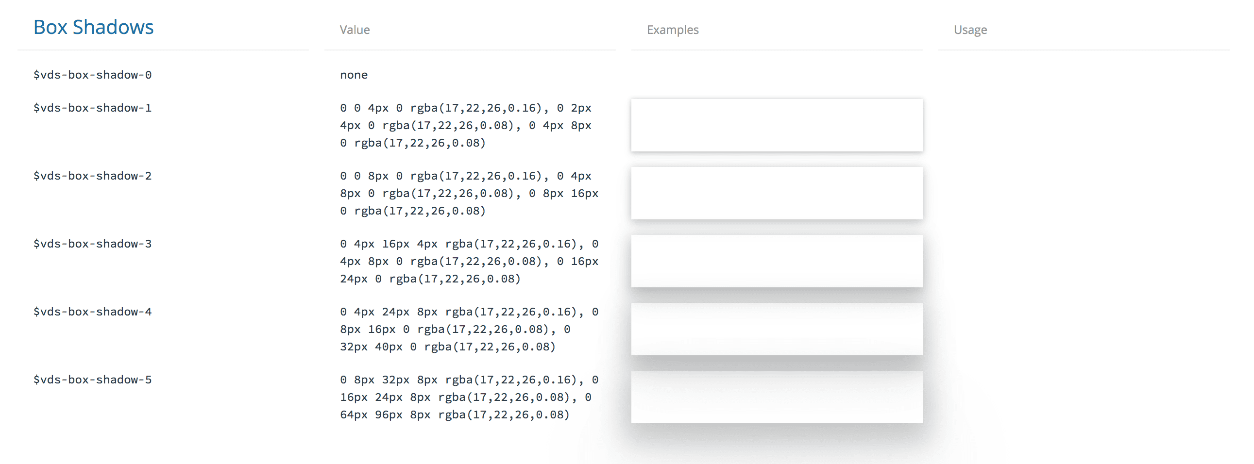 Unfortunately there are not a lot of examples of shadow and elevation tokens. But Udacity Veritas and Sprout Social Seeds show shadow and elevation respectively: