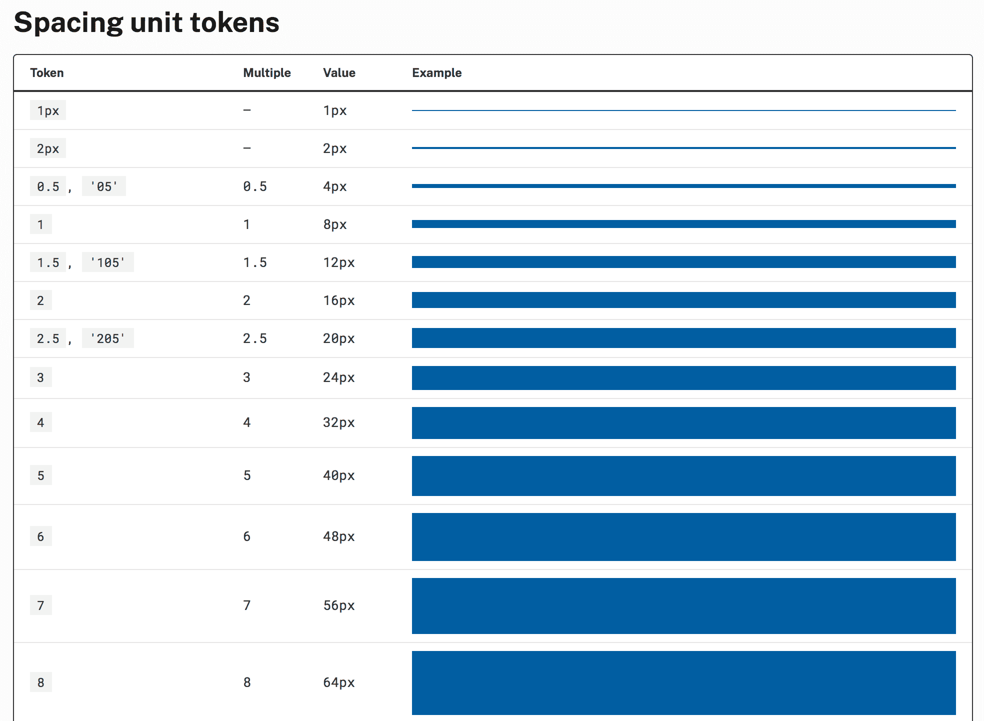 Most of the time I see sizes being shown as a square of the value, shown below. US Web Design System shows the multiple (1x, 2x, etc.) of the value along with the absolute value which makes it easy to see the rhythm.